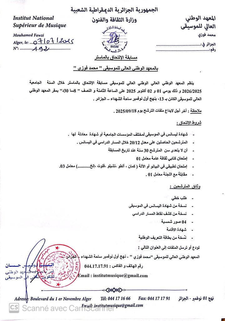 مسابقة القبول الجامعي 2025-2026 للدخول إلى المعهد الوطني العالي للموسيقى محمد فوزي