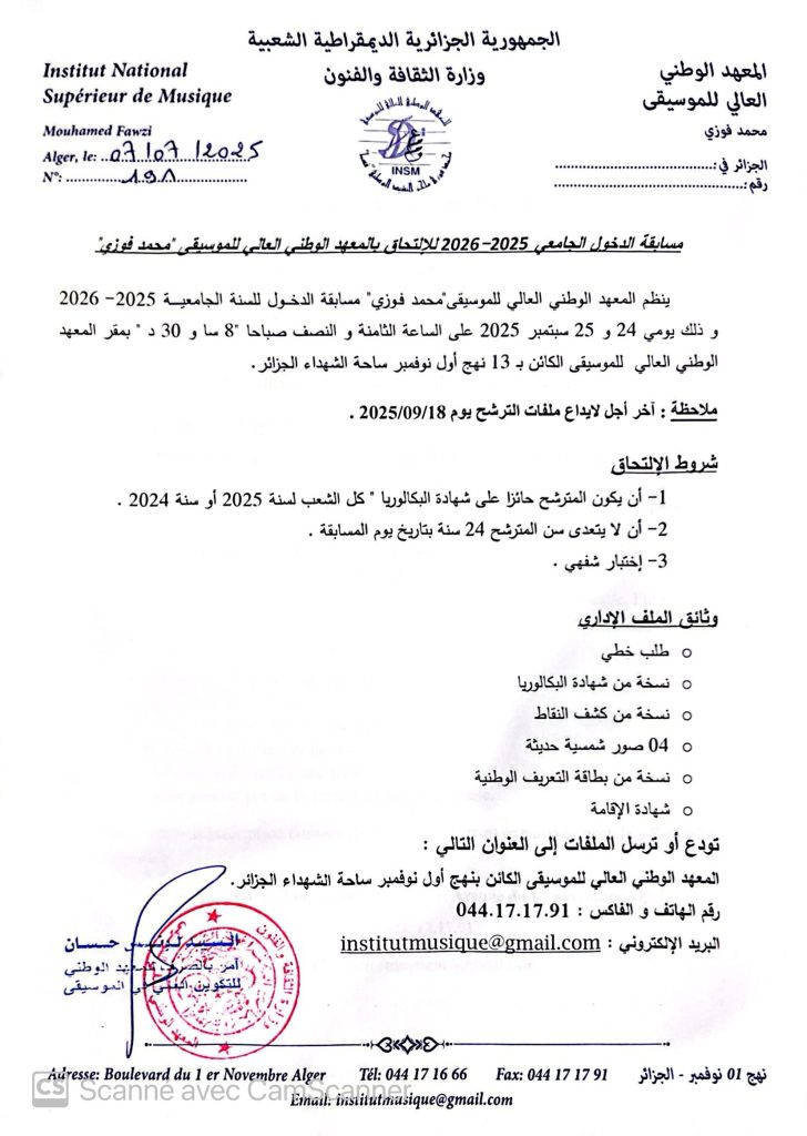 ينظم المعهد الوطني العالي للموسيقى « محمد فوزي » امتحان القبول للعام الدراسي 2025-2026، يومي 24 و 25 سبتمبر 2025 على الساعة